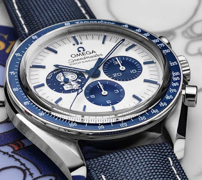 This 50th anniversary commemorative watch is designed to pay tribute to OMEGA’s winning the "Snoopy" award from NASA in 1970, commending the brand for its outstanding contributions to human space exploration such as the Apollo 13 mission. The 42mm stainless steel case is paired with a blue nylon strap, and the strap lining is imprinted with the "Apollo" mission No. 13 sailing track. The silver dial is decorated with sharp-angled hour markers and hands treated with blue PVD. The watch adopts an arc-shaped double-sided anti-reflective and wear-resistant sapphire glass mirror, which can be seen through the mirror. The three blue sub-discs respectively represent the 30-minute counter, the small second counter and the 12-hour counter. The blue sub-dial at 9 o'clock is embossed with a silver badge with the "Snoopy" pattern. The watch is equipped with a blue zirconia [ZrO2] ceramic bezel and decorated with white enamel tachymeter scale.Quality replica Omega Speedmaster watches on sale.